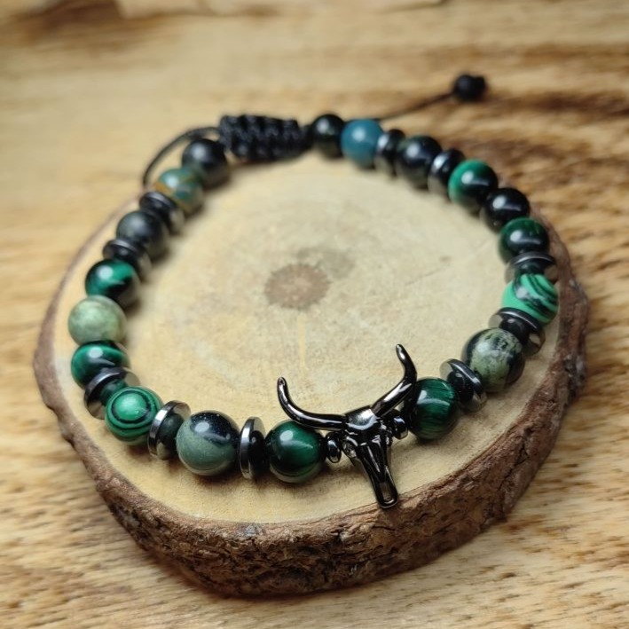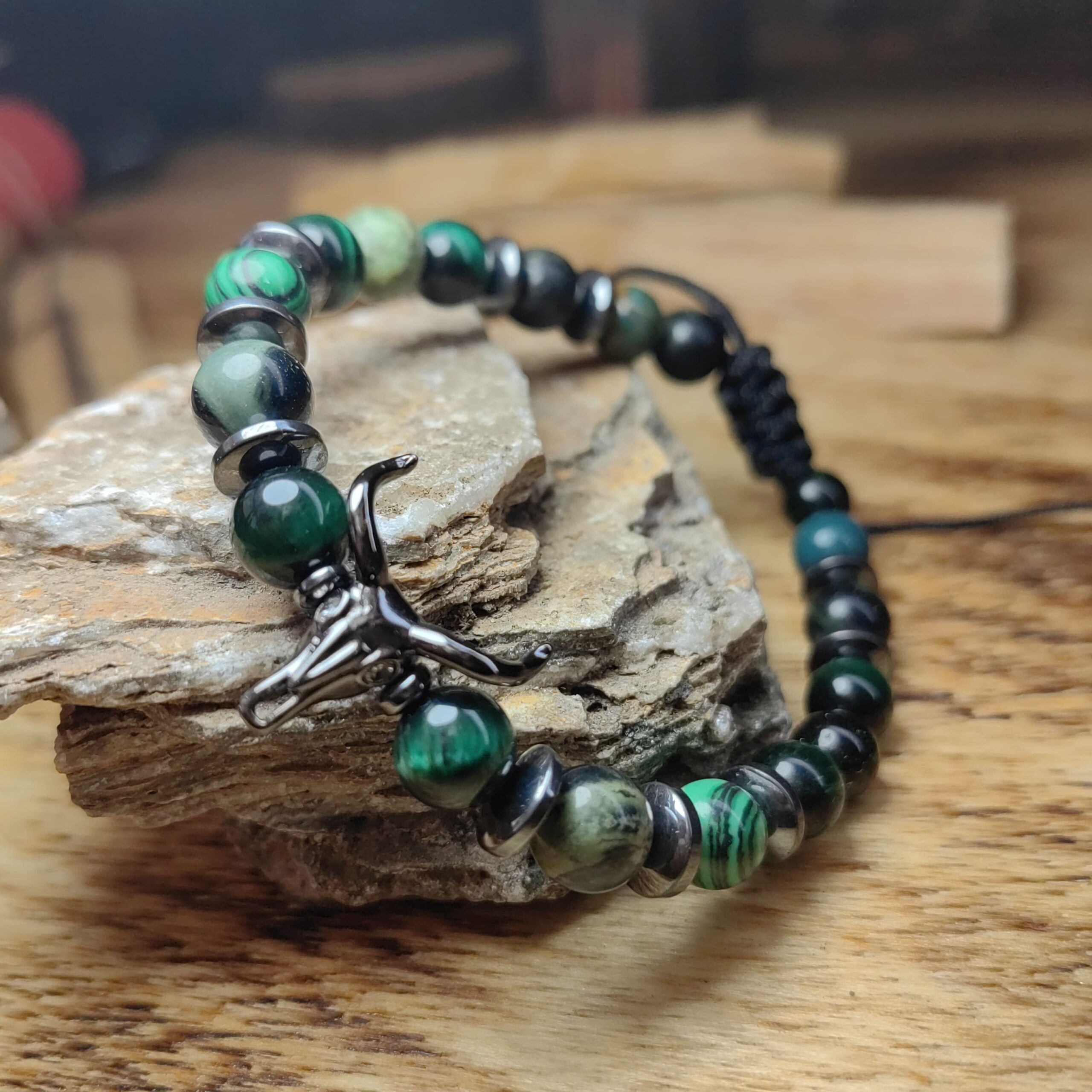 Este modelo de brazalete contiene piedras naturales como: Turquesa, jade, malaquita y ojo de tigre.
