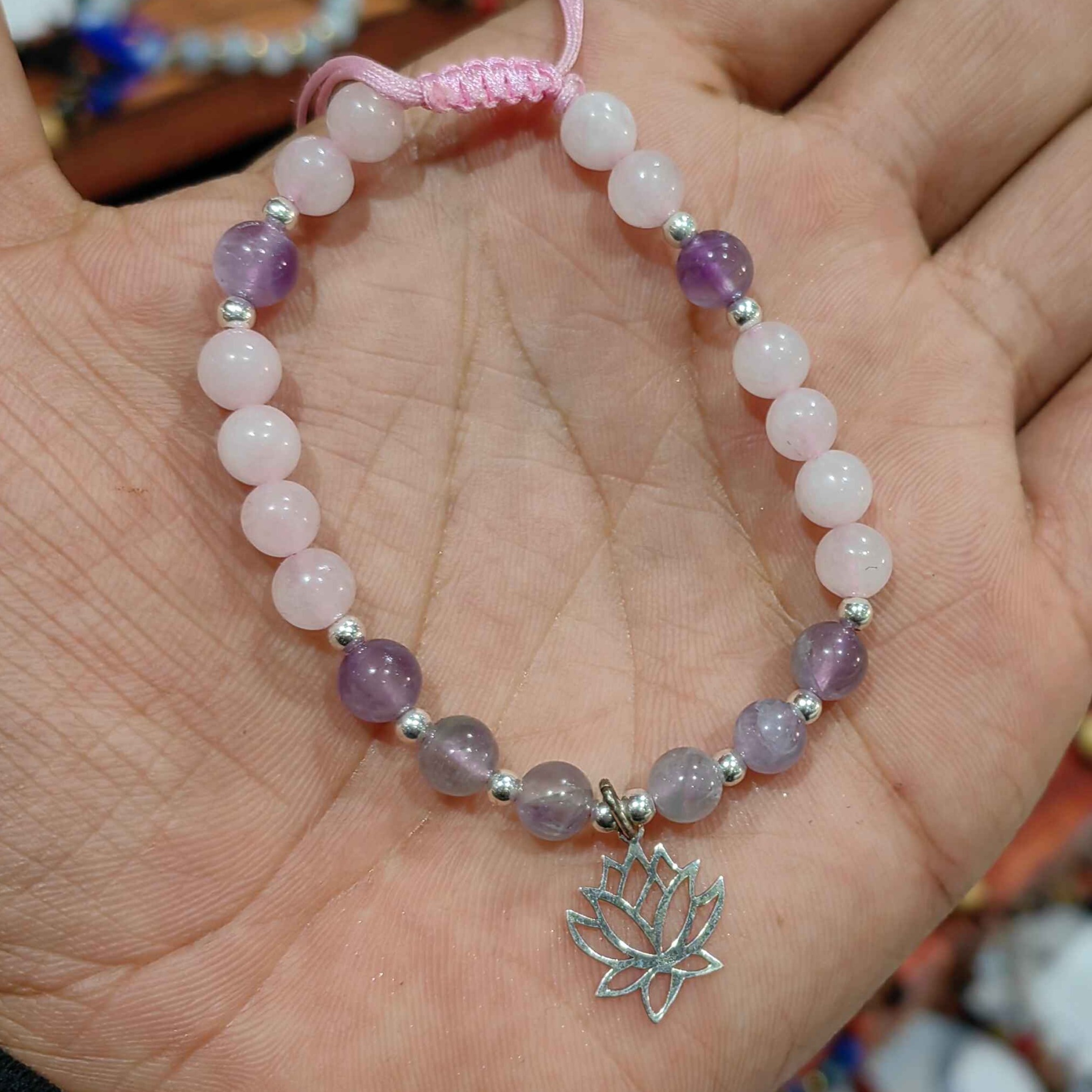 Este modelo de brazalete contiene plata.925 con piedras naturales como: amatista y cuarzo rosa.